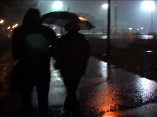 we cut across McCarren Park on our way to Pete's Candy Store -- in heavy rain -- filmed by Benn ---