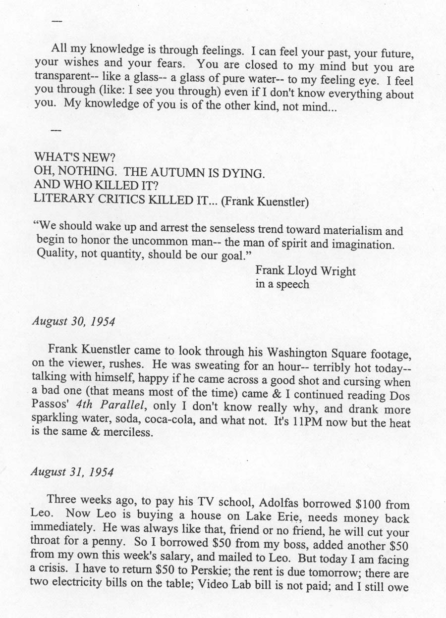My written diaries covering the years 1953-1964. Continuation of I Had Nowhere to Go which covered years 1944-1953. This volume covers a lot of my film activities of the period: the creation of Film Culture magazine, Film-Makers' Cooperative, New American Cinema Group, travelling film expositions in Europe, life in New York etc. etc. It will contain many rare photographs and documents from the period.